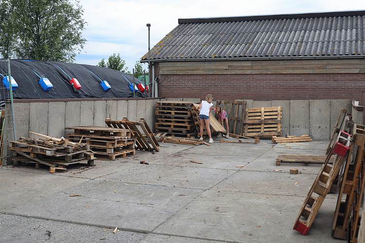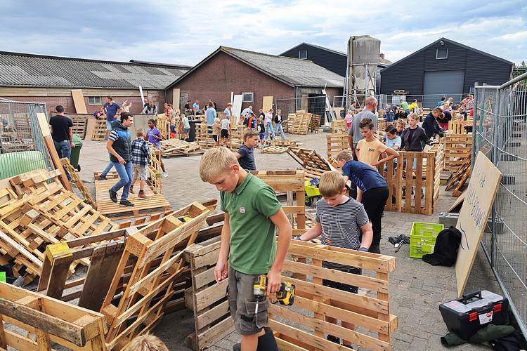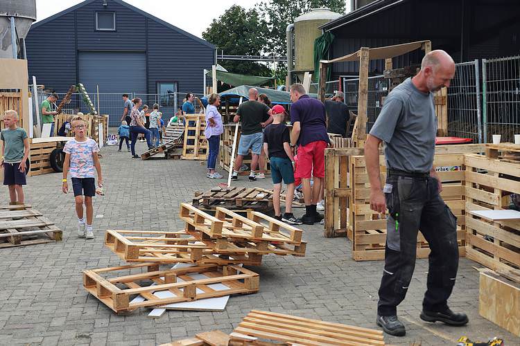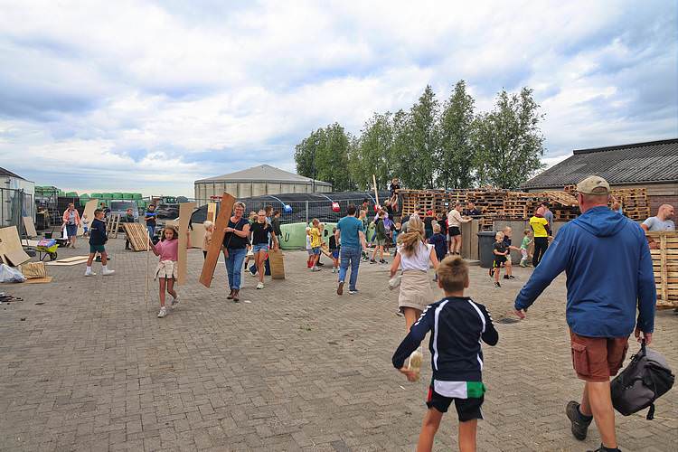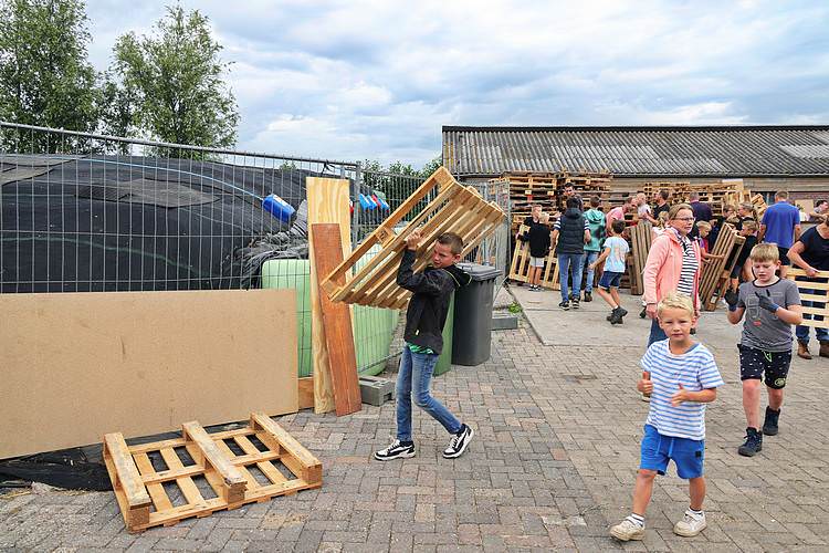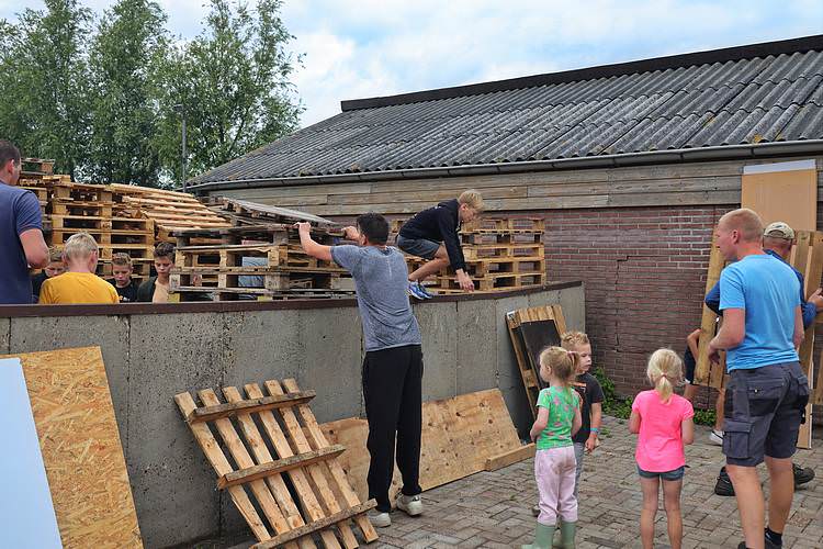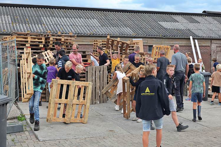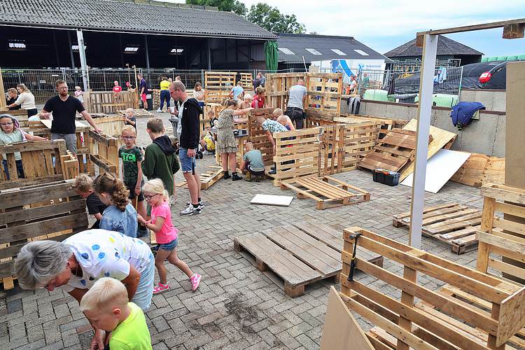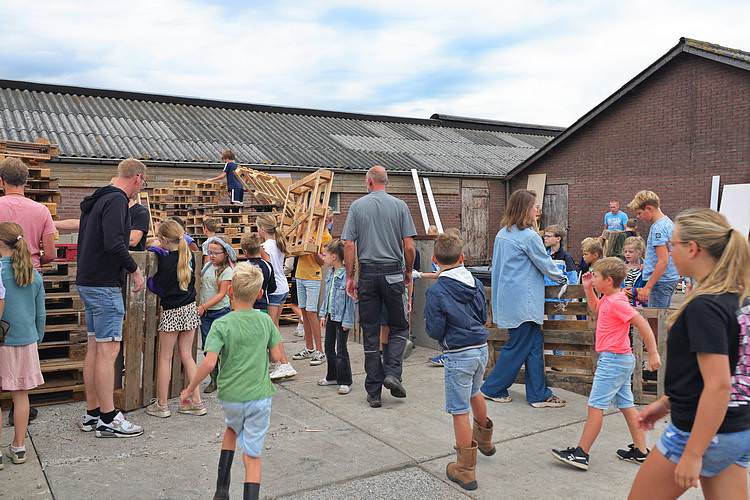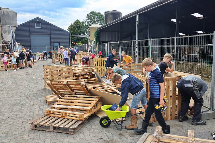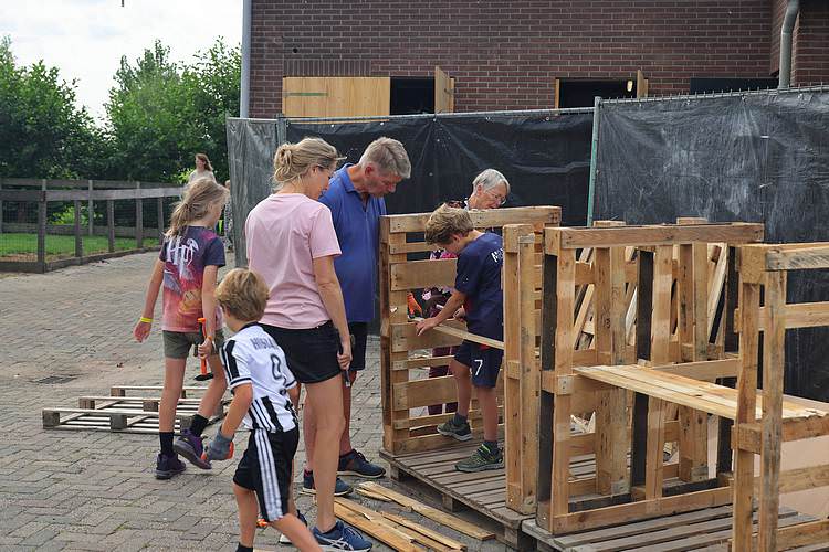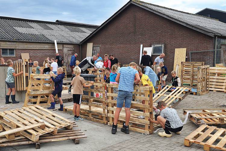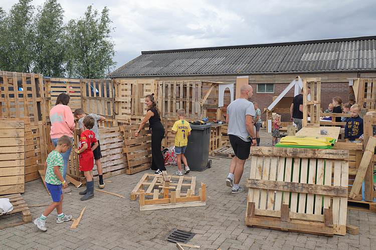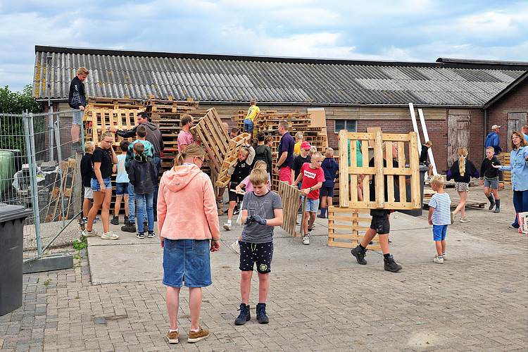 De speelweek en huttenbouw in de laatste vakantieweek was ook dit jaar weer op de bekende en vertrouwde locatie bij 'Boer Bert' aan de Groendijck. Op het erf lag al een grote stapel pallet’s en ander geschikt hout op de jeugdige timmerlieden (en hun assistentie) te wachten. Donderdag kon er vanaf 10 uur tot half 4 naar hartelust worden gebouwd met een lekkere lunch in de hutten. Vrijdag konden de hutten worden ingericht en was er de verkoping en een groot springkussen. Vanaf 2 uur kon er weer worden gesloopt en 's-avonds om 7 uur begon de verbranding van het sloophout op de 'Kromme Kamp'.
