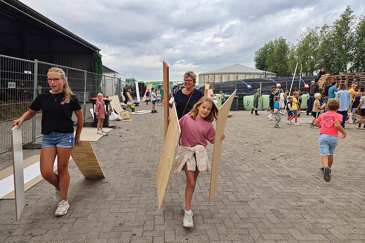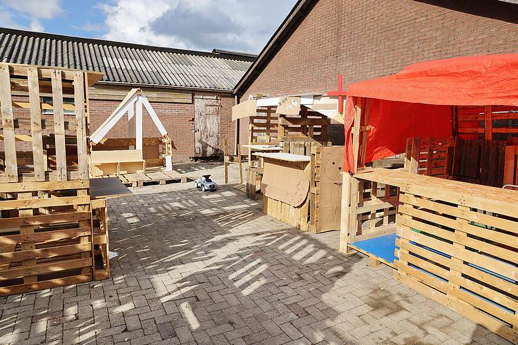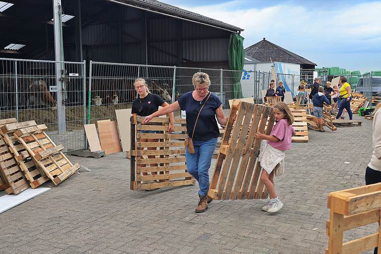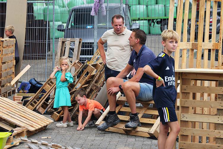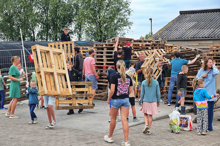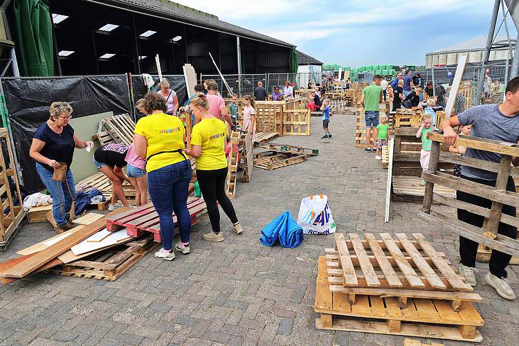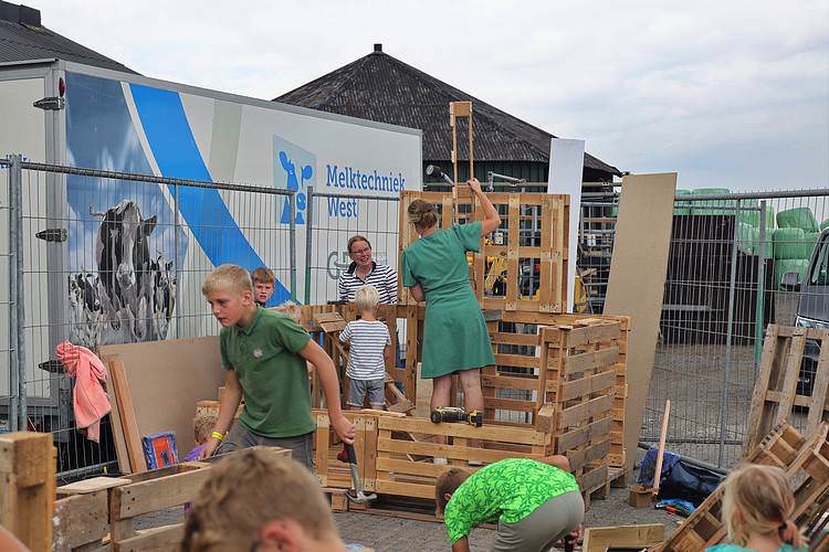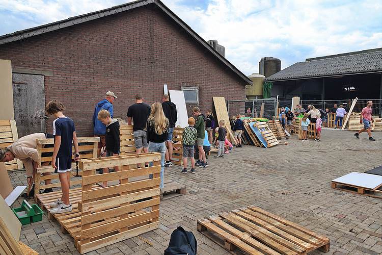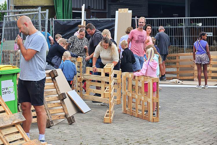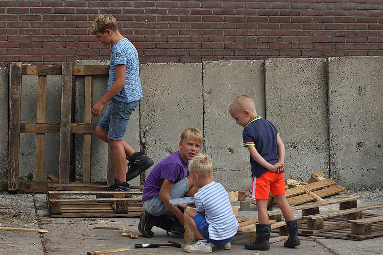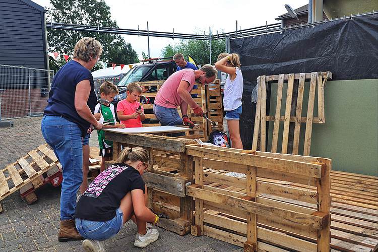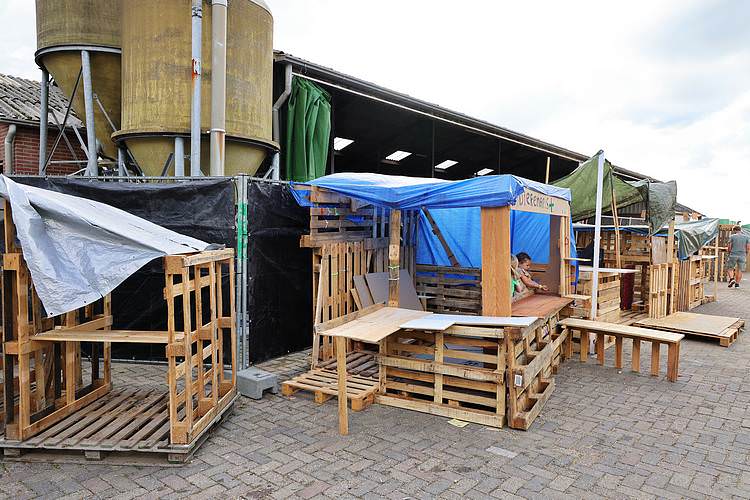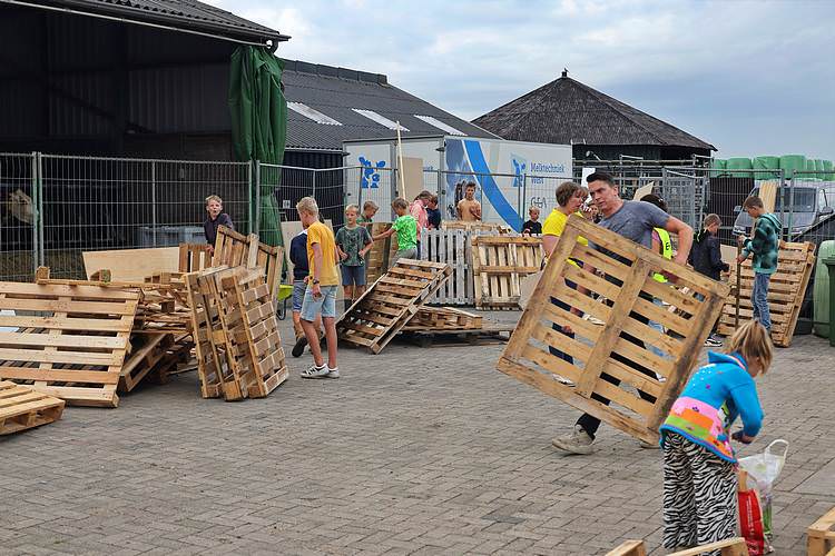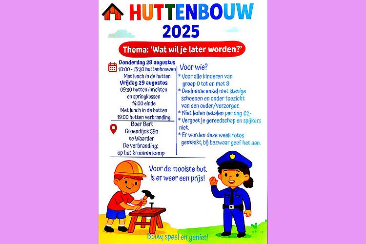 De speelweek en huttenbouw in de laatste vakantieweek was ook dit jaar weer op de bekende en vertrouwde locatie bij 'Boer Bert' aan de Groendijck. Op het erf lag al een grote stapel pallet’s en ander geschikt hout op de jeugdige timmerlieden (en hun assistentie) te wachten. Donderdag kon er vanaf 10 uur tot half 4 naar hartelust worden gebouwd met een lekkere lunch in de hutten. Vrijdag konden de hutten worden ingericht en was er de verkoping en een groot springkussen. Vanaf 2 uur kon er weer worden gesloopt en 's-avonds om 7 uur begon de verbranding van het sloophout op de 'Kromme Kamp'.