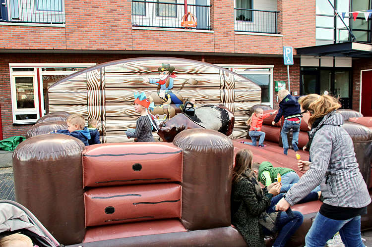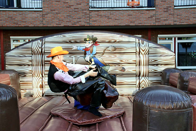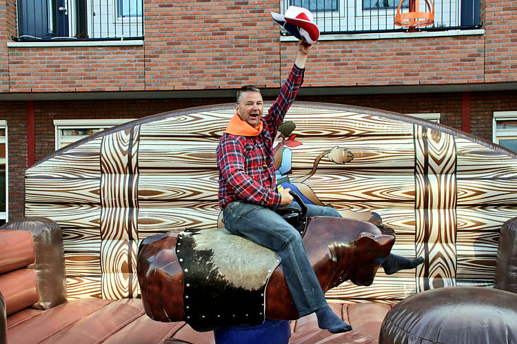 Naast de hapjes en de drankjes waren er voor alle leeftijden stevige uitdagingen zoals het zo lang mogelijk berijden van een wilde stier.