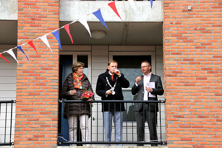 Vanaf de galerij op de 1e verdieping hield burgemeester Christiaan van der Kamp zijn toespraak en gaf het voorbeeld bij de aubade,